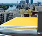 Por medio de unas guias se desplaza la lona con una tensión continua que le proporcionan unos muelles tensores. Este sistema debe estar obligatoriamente motorizado.